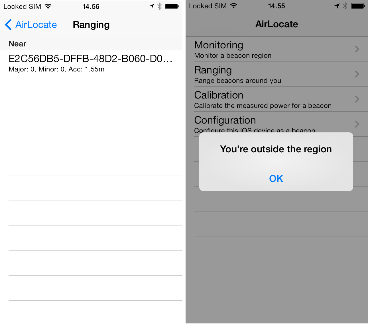 I was able to pick up the Raspberry Pi’s beacon signal using AirLocate on iOS and iBeacon Locate on Android. There were some problems with the sample apps, when I configured the beacon to use a custom device UUID instead of an Apple demo UUID: the demo apps failed to detect the beacon when using custom a UUID. A custom application was, however, able to detect the beacon also with a custom UUID.
